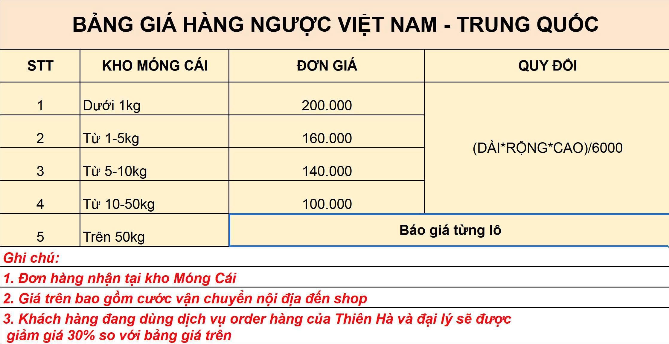 Đơn giá trên đã bao gồm cước vận chuyển nội địa đến kho Thiên Hà Express.